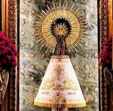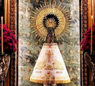 La leyenda cuenta que la Virgen del Pilar se apareció a Santiago el Mayor sobre una columna, mientras este rezaba a orillas del Ebro. El fuego, presente en las velas que los fieles encienden a sus pies, simboliza la fe y la devoción.